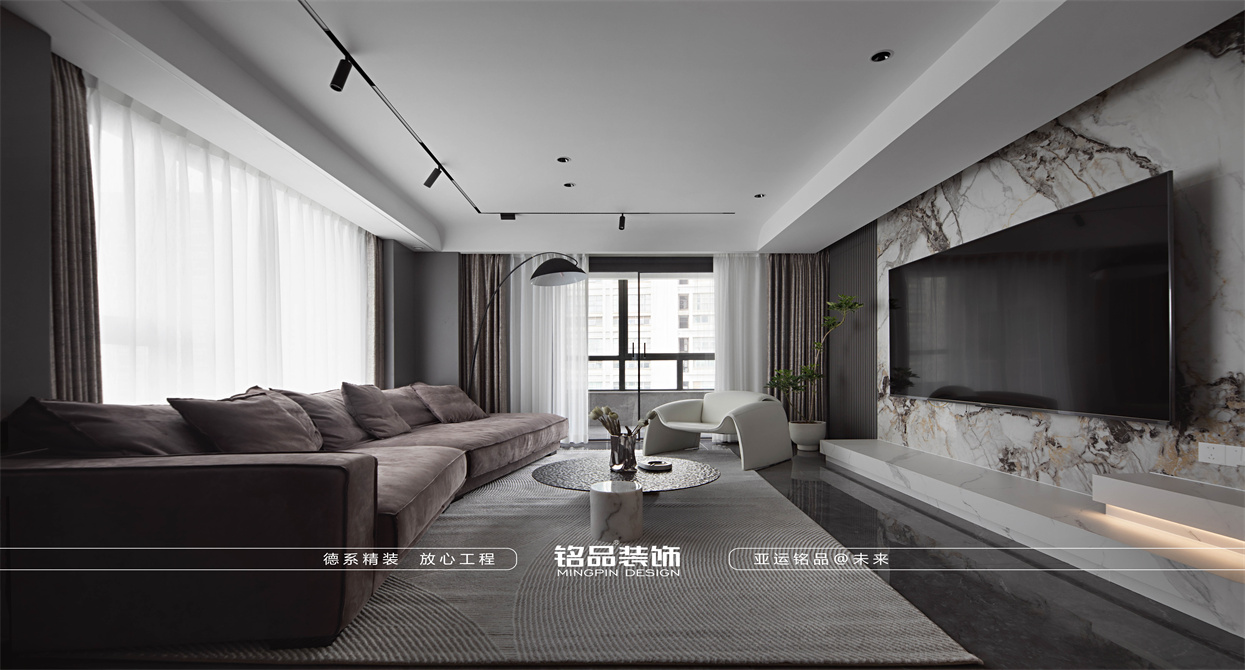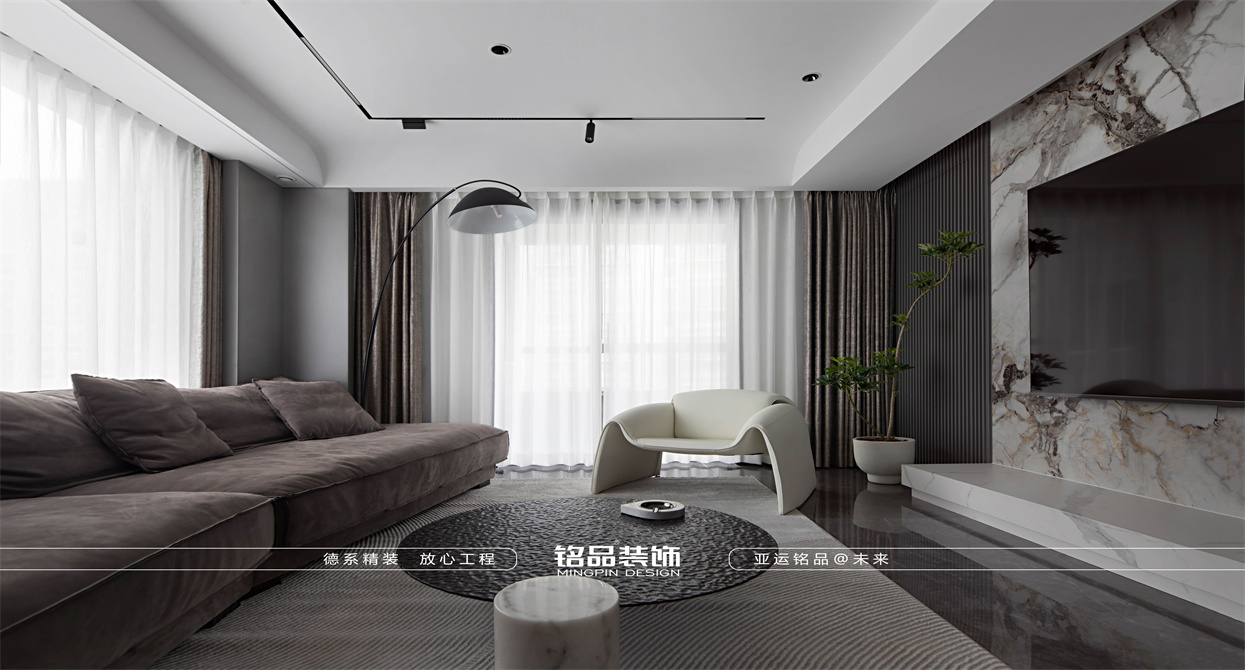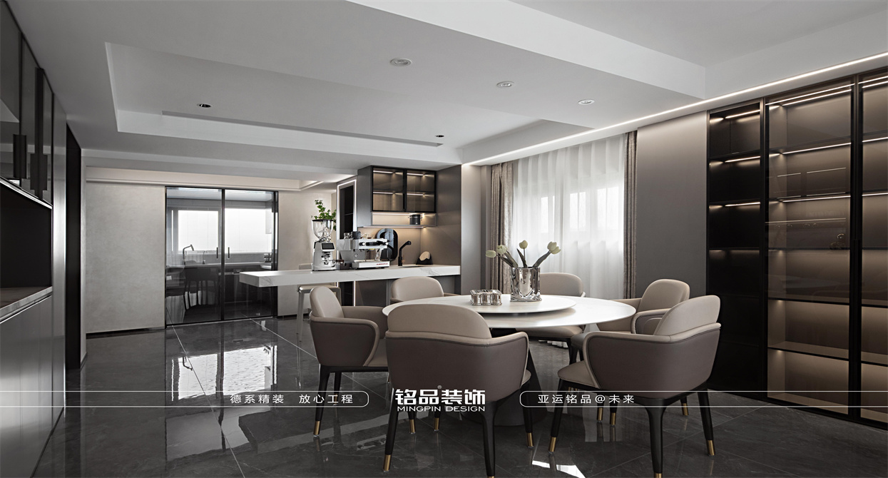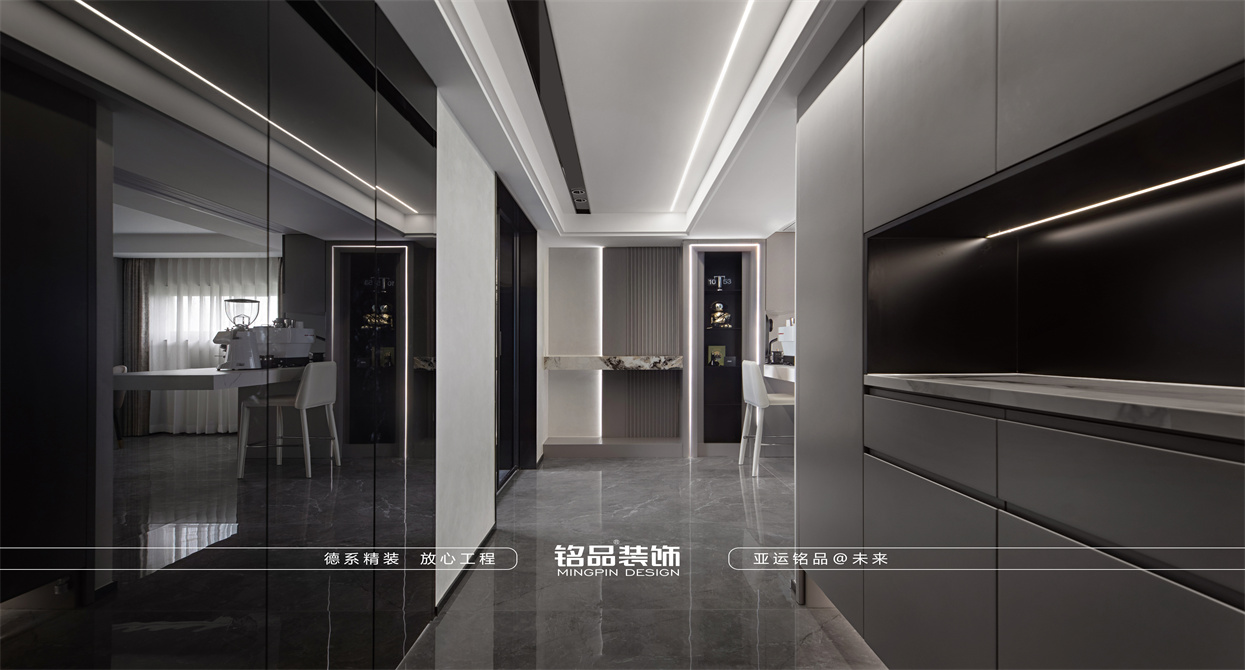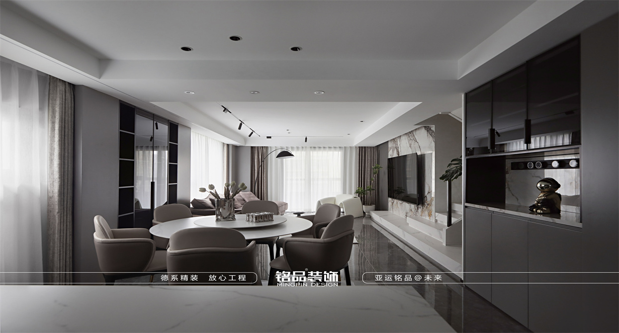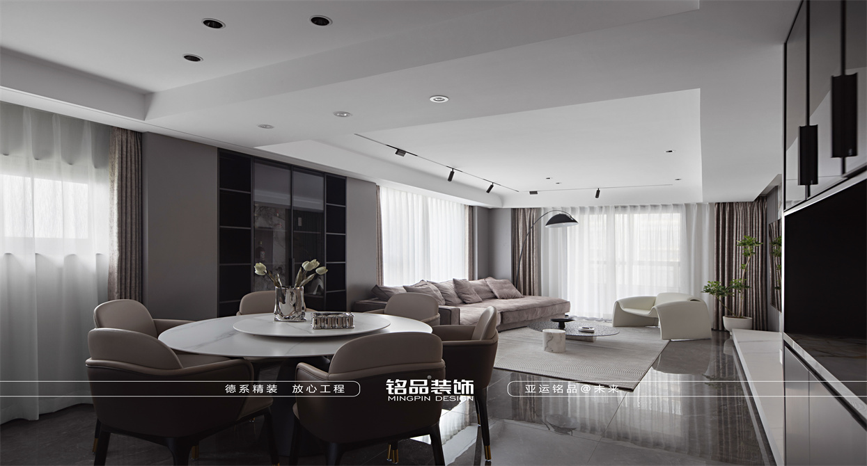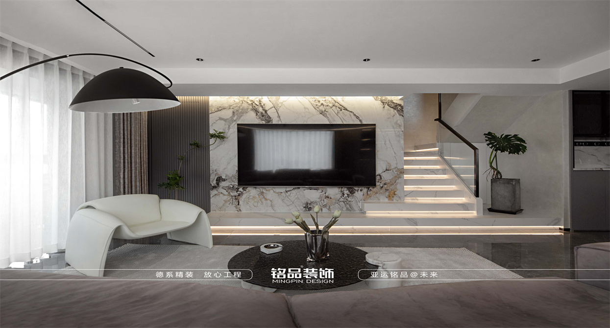 整体色调采用黑白灰的设计元素,让空间显得沉稳又不失时尚,灯光的延伸使整个空间更具立体感。楼梯和电视柜的叠加,加上灯光的加持,使空间更具趣味性。玻璃的圆形茶几,配合简约的家具陈设,使整体更具艺术气息。不锈钢的点缀,让空间更加的精致,干净,纯粹,做了无主灯的设计,高级感十足。
