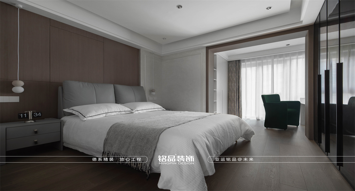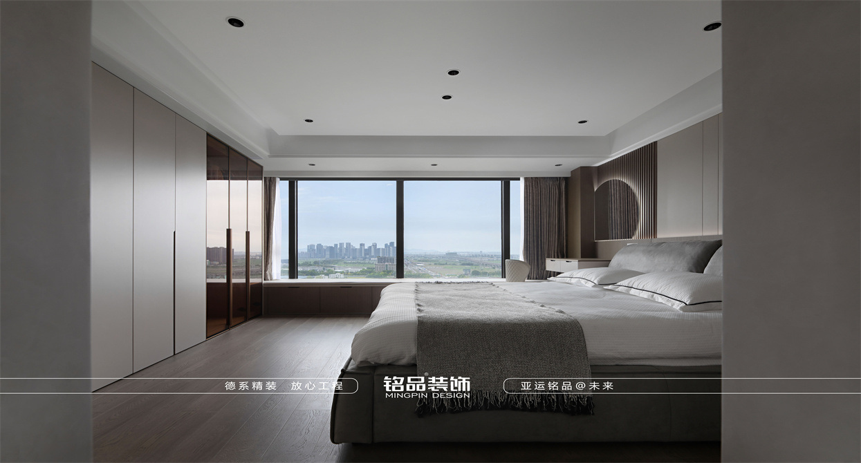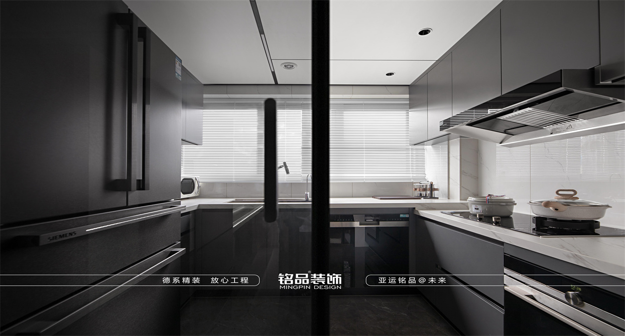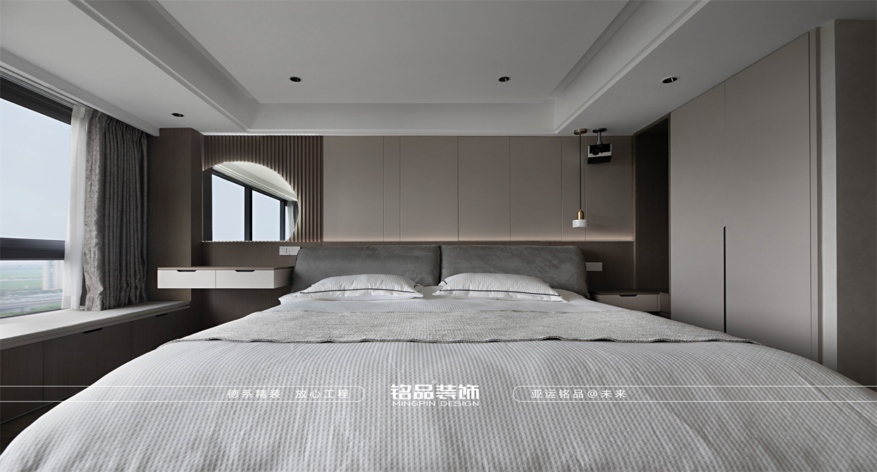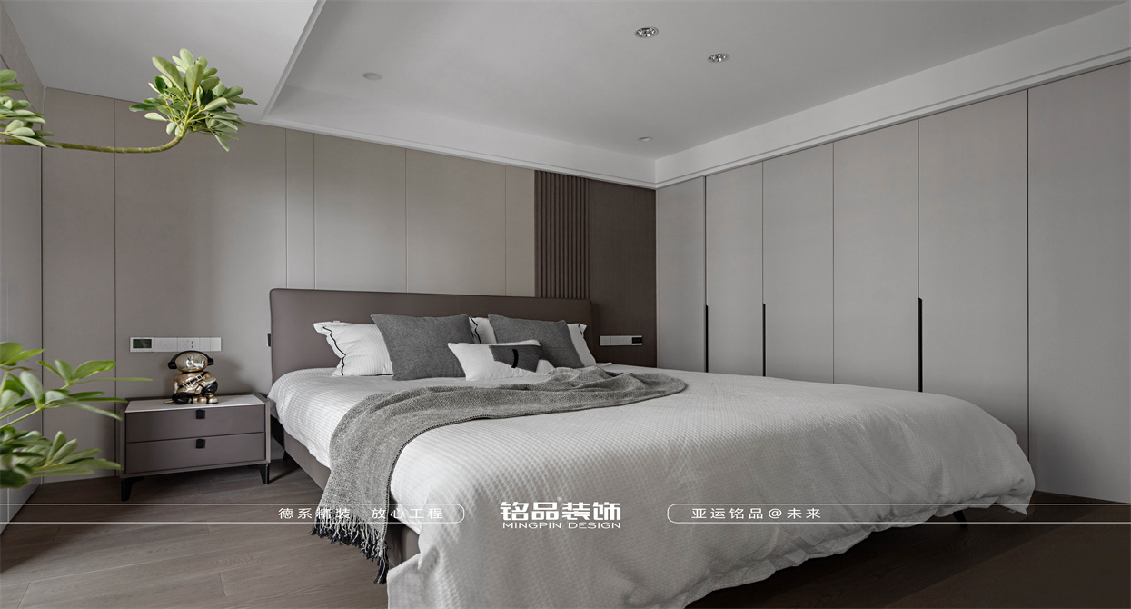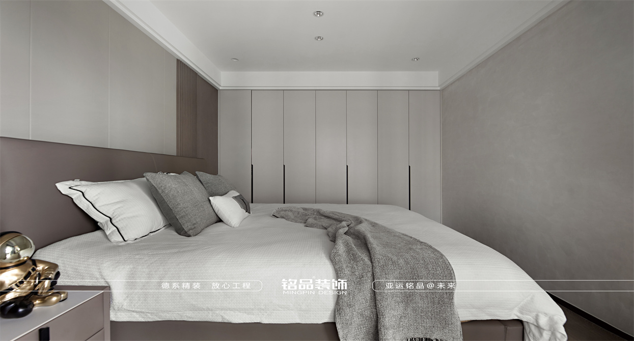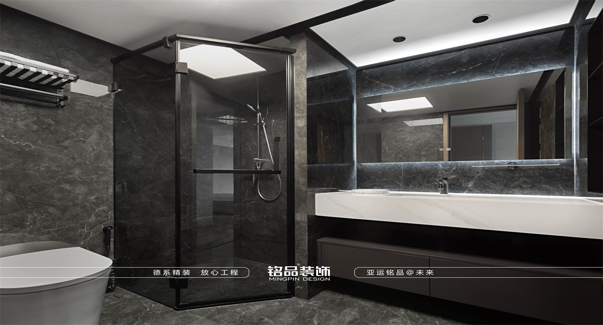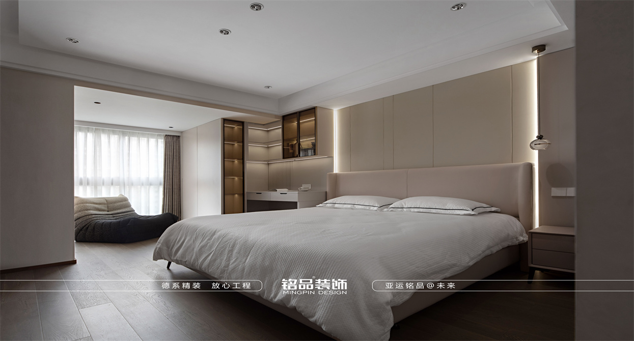 整体色调采用黑白灰的设计元素,让空间显得沉稳又不失时尚,灯光的延伸使整个空间更具立体感。楼梯和电视柜的叠加,加上灯光的加持,使空间更具趣味性。玻璃的圆形茶几,配合简约的家具陈设,使整体更具艺术气息。不锈钢的点缀,让空间更加的精致,干净,纯粹,做了无主灯的设计,高级感十足。
