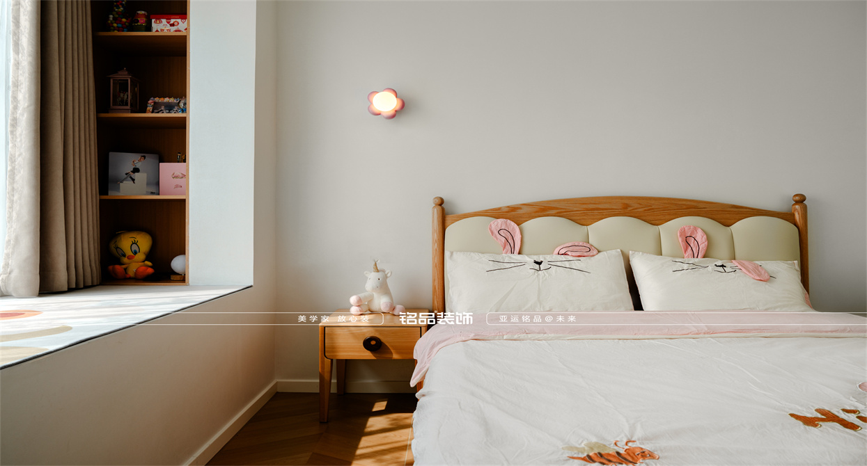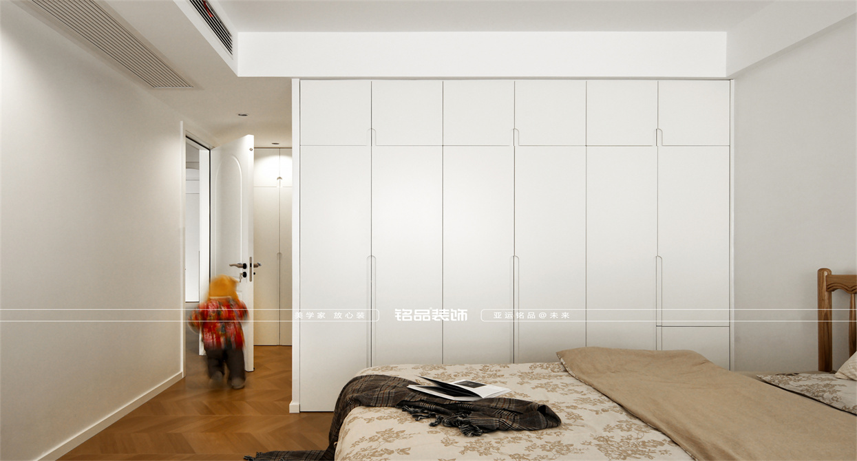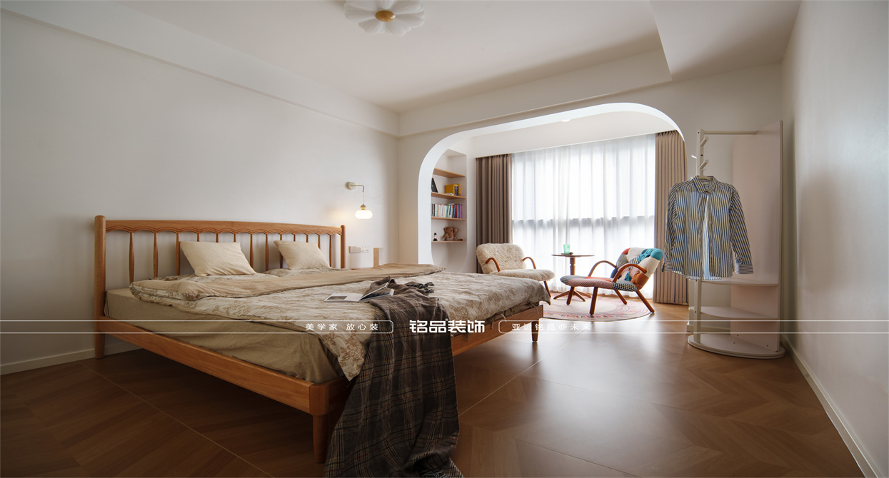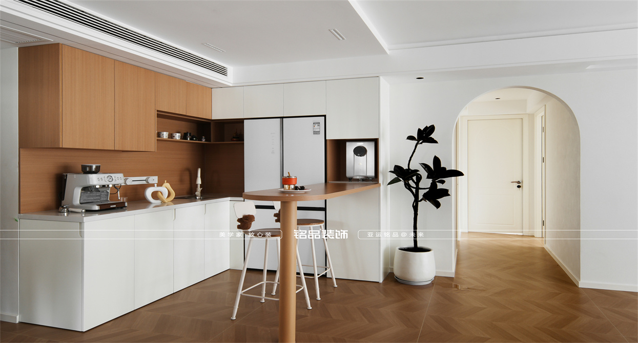 本案以奶油原木风为基调,采用去客厅化的设计,打破传统客厅布局的全新设计理念,重新塑造空间的功能与价值。它摒弃了以电视、沙发、茶几为核心的固定模式,转换成以居住者的实际需求为核心,将客餐厅打造成家庭活动的核心区域,成为一个多功能、灵活且个性化的生活空间,增加了家庭成员之间的互动性,促进沟通与交流,同时兼具了美观性与实用性,通过嵌入式柜体,不同组合的开放式与隐藏式收纳,最大化利用空间,提升空间利用率。这种个性化的设计表达出了业主开朗随和的性格,体现业主积极向上的人生态度和生活方式。